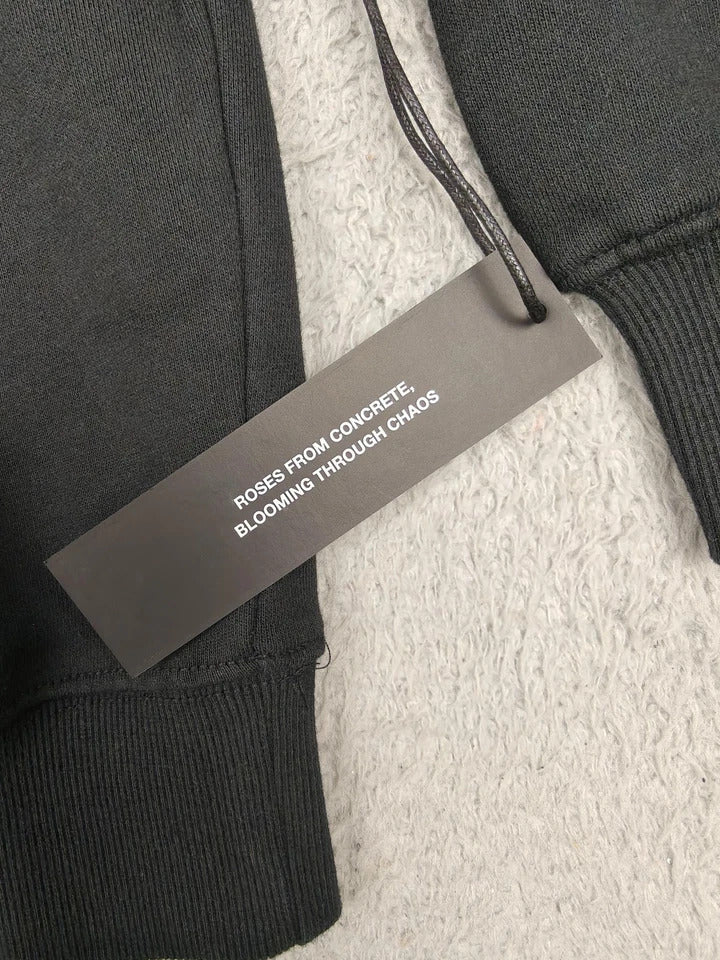 Snap-button hoodie with concrete rose graphic.